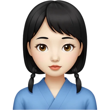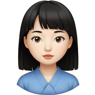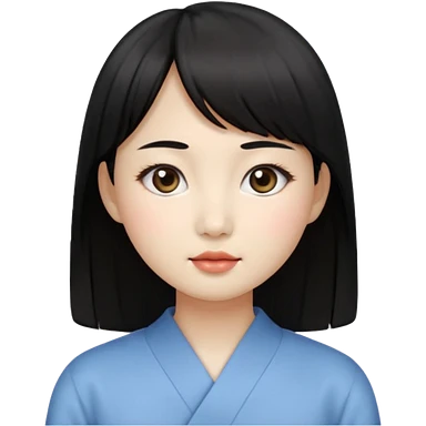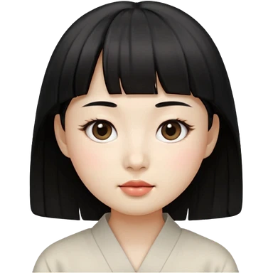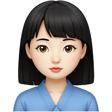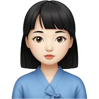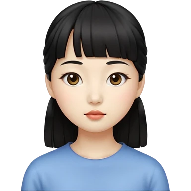 Clean Korean illustration-style emoji portrait of a young Korean woman, front-facing. Smooth porcelain skin, soft shading, large round eyes, calm neutral expression. Straight black bangs, black hair tied back, small nose and lips. Round oval face, soft jawline. emoji