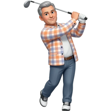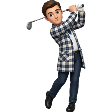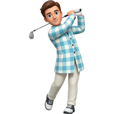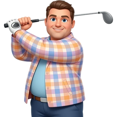 picture of a man making a golf swing while wearing a plaid sports coat. The sports coat colours should be pastel emoji