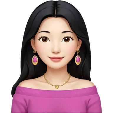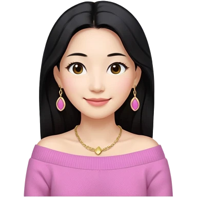 South Korean girl in her mid-thirties with long black hair and a middle part. She is wearing a pink colored, off the shoulder long sleeve knit sweater. She has small gold earrings and a gold necklace. She has brown eyes with narrow, mono lid shape and smiling with lips together emoji