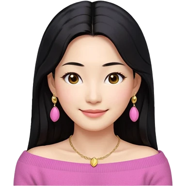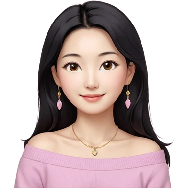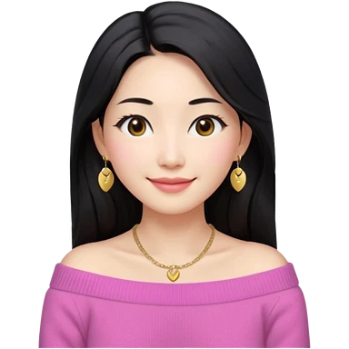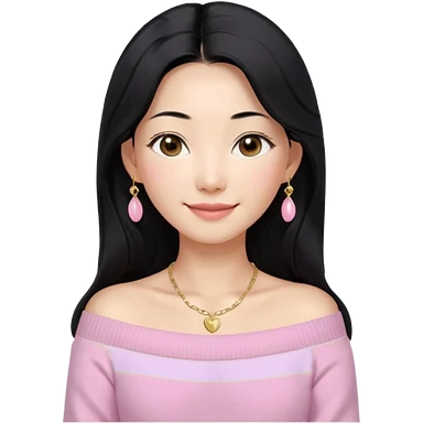 South Korean girl in her mid-thirties with long black hair and a middle part. She is wearing a baby pink, off the shoulder long sleeve knit sweater. She has small gold earrings and a gold necklace. She has brown eyes with narrow, mono lid shape and smiling with lips together emoji