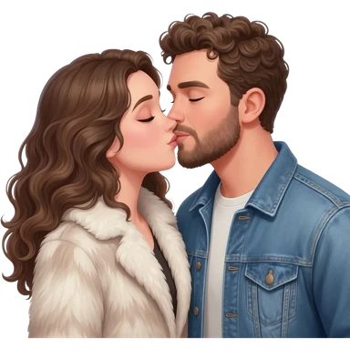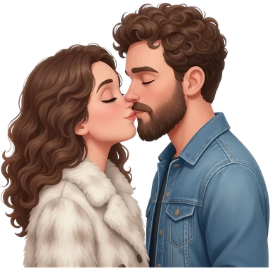 handsome white man with short brown curly hair and a thick beard kissing a white woman with long brown curly hair. she is wearing a fur coat, he is wearing a denim jacket emoji