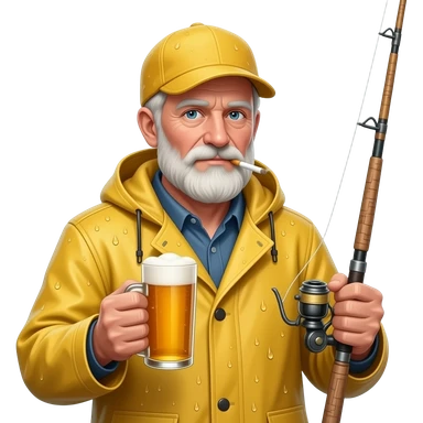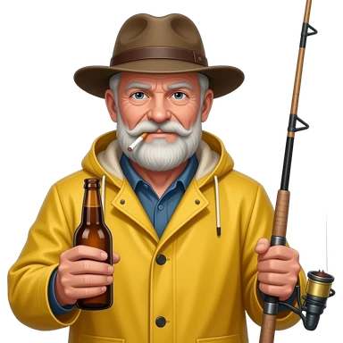 An old weathered fisherman wearing a yellow rain outfit and yellow hat with a ciggarette hanging out of his mouth, a beer in one hand, and a fishing rod in the other hand emoji