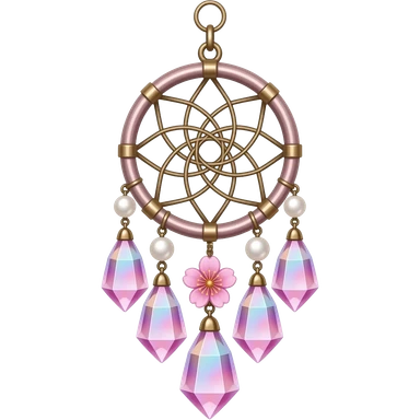 Hanging pastel Sakura-pink white gold crystals white-pearly dreamcatcher with bells and feathery ornament emoji