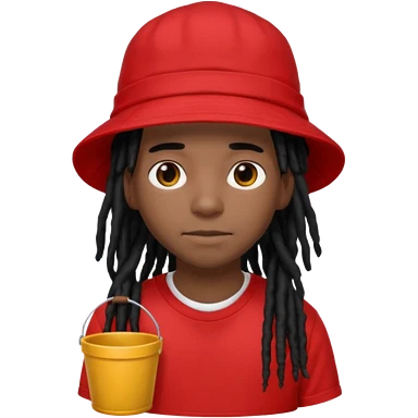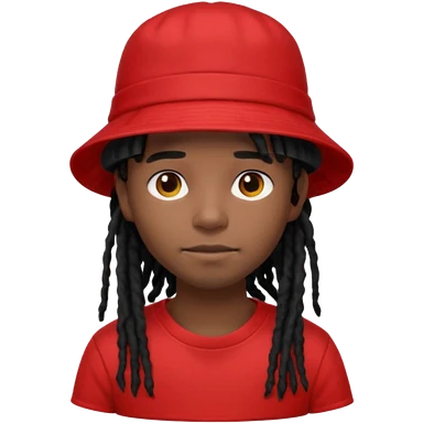 dark brown skin, black hair dreadlocks, wear red t-shirt, black bucket hat emoji