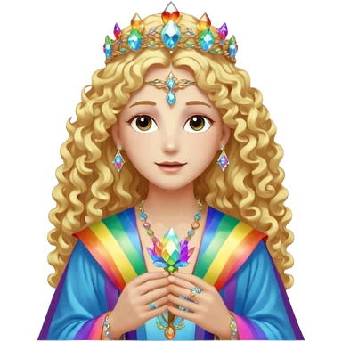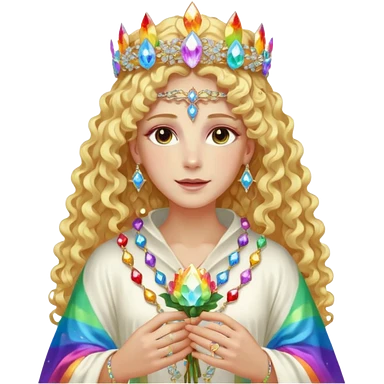 a being made of light pleidian nordic long faces and curly blond hair but beautiful features of light wearing jewels and a rainbow halo like a saint arount herwith a robe on made of light and diamonds semi transparent belly dancer and who is lanky holding a bouquet of crystal flowers on rainbow fire emoji