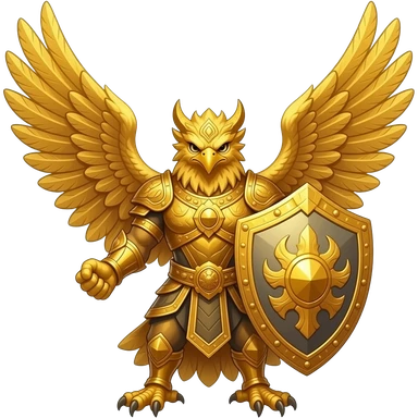 Sadayu, the mythical giant golden eagle, spreading large golden wings to protect a sacred object, protective shield aura, fierce guardian expression, sky background. emoji