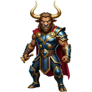 Thorapi, the mythical bull warrior, golden horns, standing arrogantly, cutting glowing chains between objects, fierce expression, thunder atmosphere, dark field background. emoji