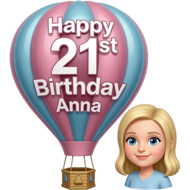 Happy 21st Birthday Anna written on a hot air balloon blond girl in basket emoji | AI Emoji Generator