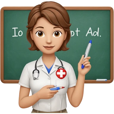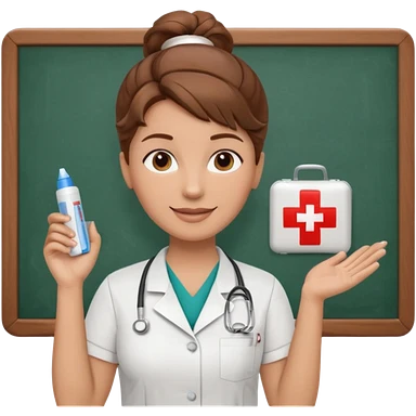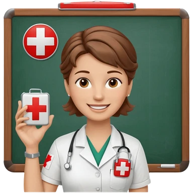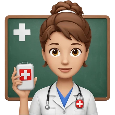 happy teacher with white board brown hair updo, first aid shirt emoji