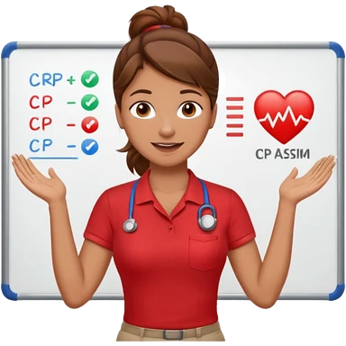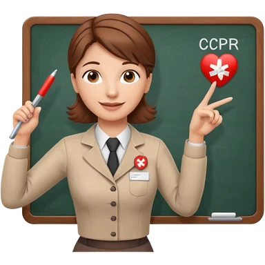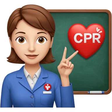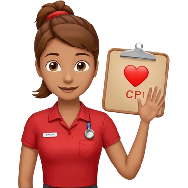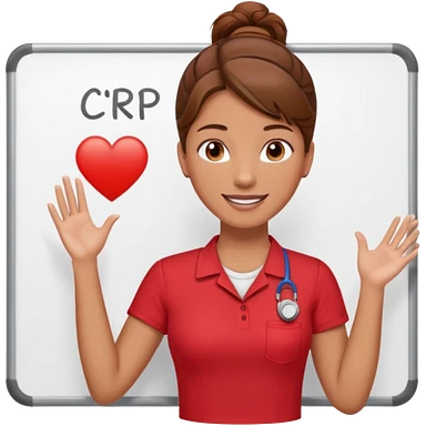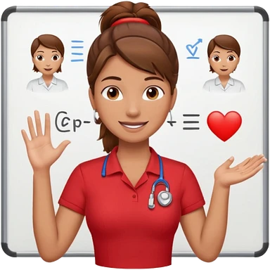 Happy instructor female brown hair whit board hair up red shirt add CPR to white board emoji