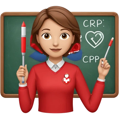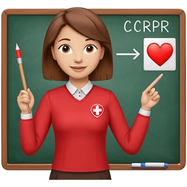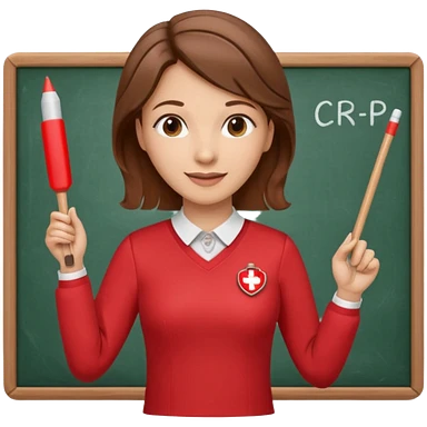Happy Teacher, female, brown hair up, wearing a red long sleeve top holding a pointer stick to a white board with a CPR logo. emoji