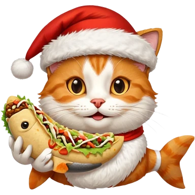 Happy Cat wearing a Santa hat and holding a fish taco emoji