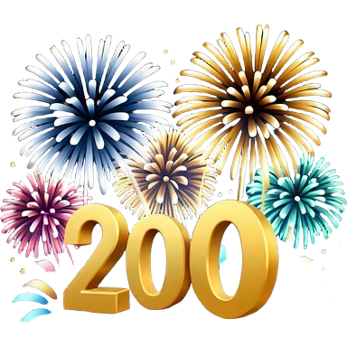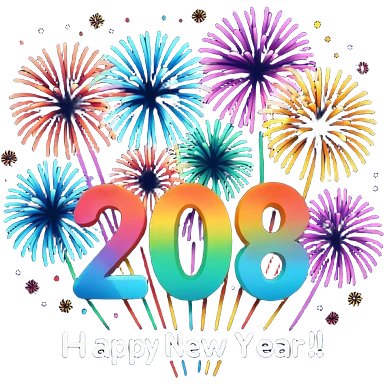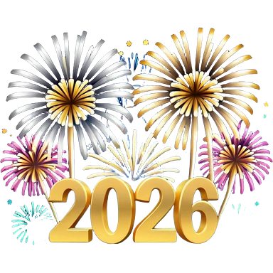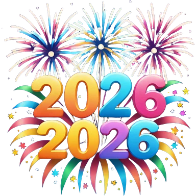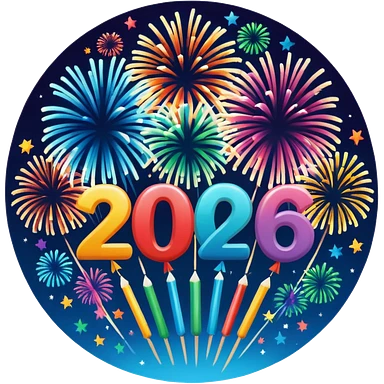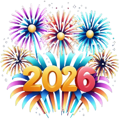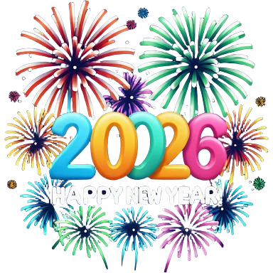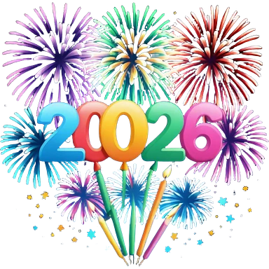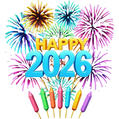 "Happy 2026" in backdrop of colourful fireworks in outline artwork emoji