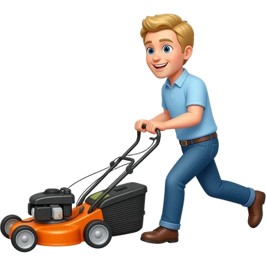 Happy man with blond hair speedily pushing an orange lawn mower emoji
