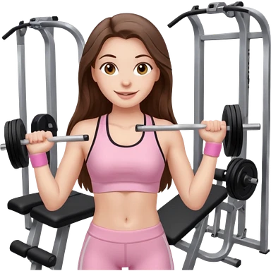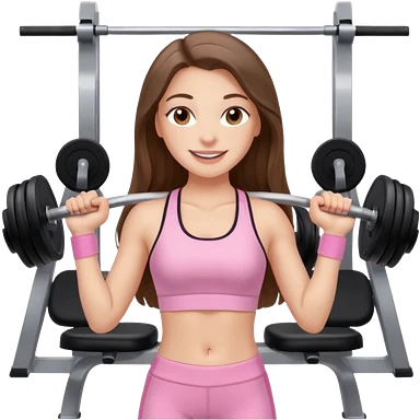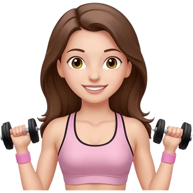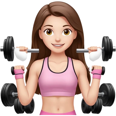 happy white long brunette hair girl with hazel eyes in light pink workout clothes at the gym emoji