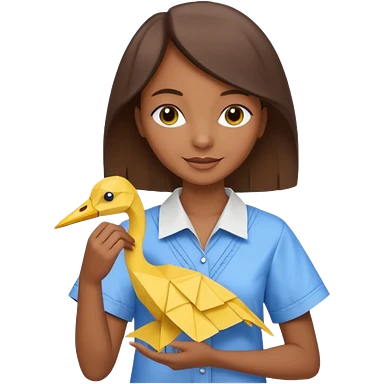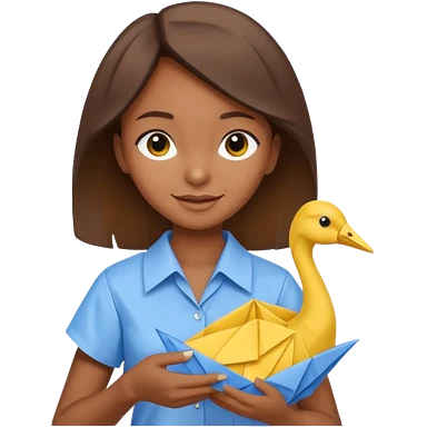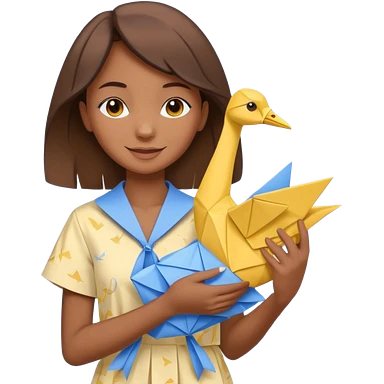 happy-african-young-girl-with-brown-hair-in-a-white-kanga-shirt-holds-an-origami-yellow-and-blue-crane emoji | AI Emoji Generator