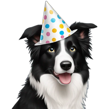 A happy Australian Border Collie with a half-black, half-white face wearing a Birthday Party Hat. emoji