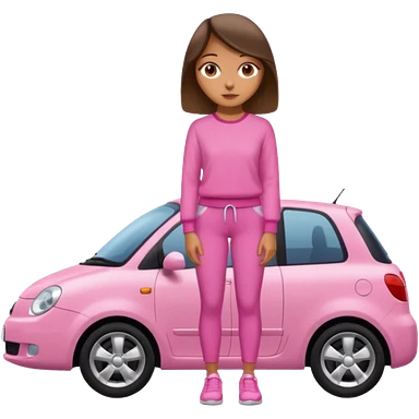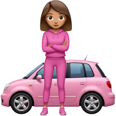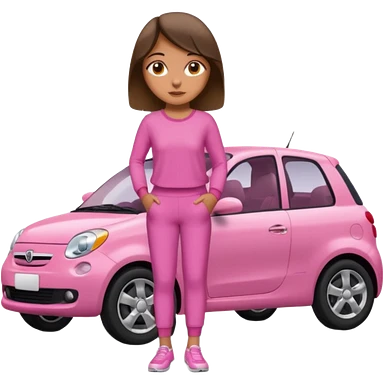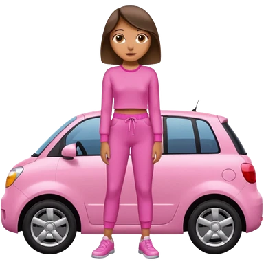Create me a emoji girl with brown eyes in a pink outfit leaning on a car full body emoji
