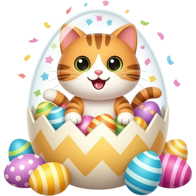 a happy cat in a confetti egg surrounded by easter eggs emoji