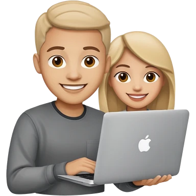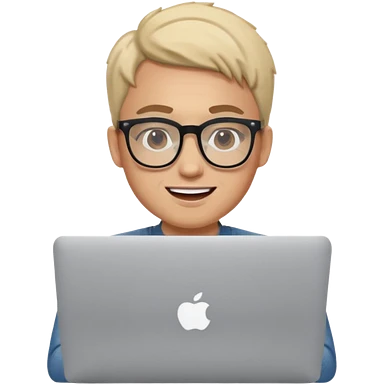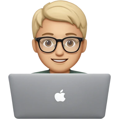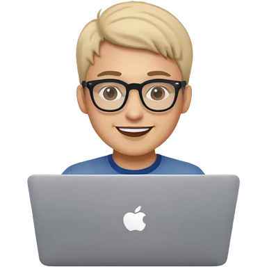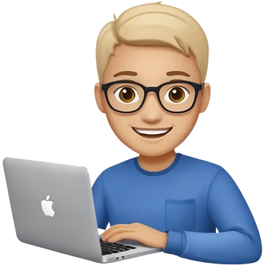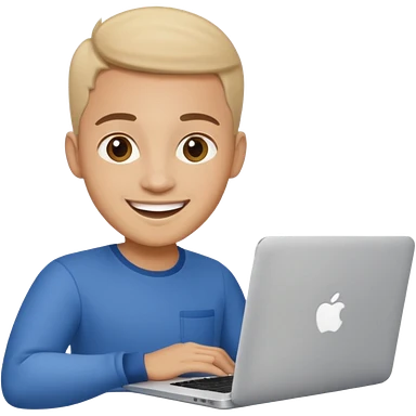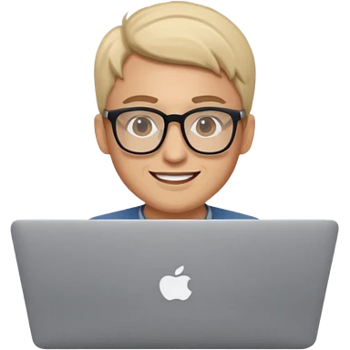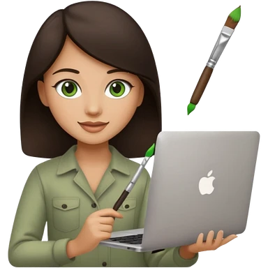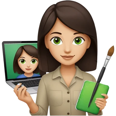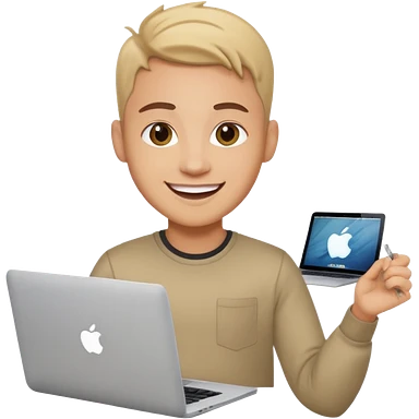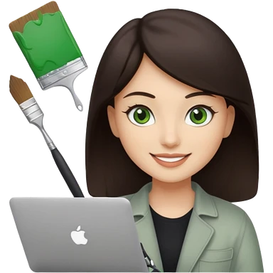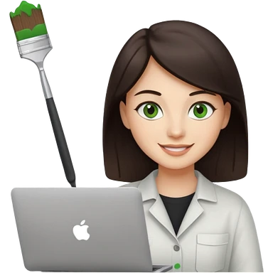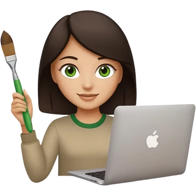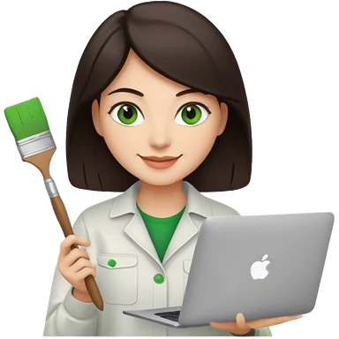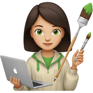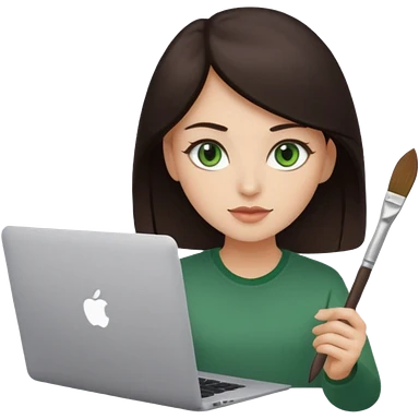 happy Graphic designer whit a MacBook, him eyes green color and dark brown hair, he is paint artist emoji