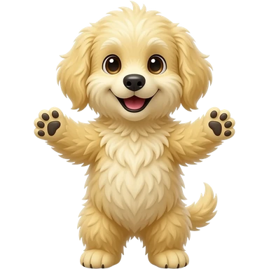A completely light yellow dog, standing up with legs and arms open like a little person, looking at us with a very happy expression. Its body is completely light yellow. emoji