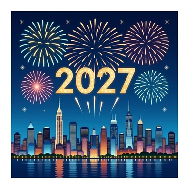 "Happy New Year 2026" in backdrop of colourful fireworks in outline emoji