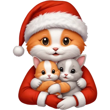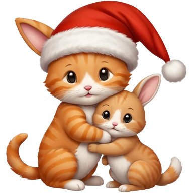 Happy Kitten wearing a Santa hat hugging a cute bunny in a Santa hat emoji