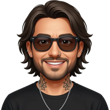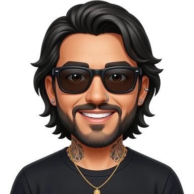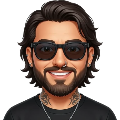The handsome manly Latino podcast host with medium length hair, a long slightly graying beard and tattoos with his ears pierced 1 time each ear and a nose ring on the right side, dark brown eyes, wearing black, dark sunglasses, and jewelry, happy emoji