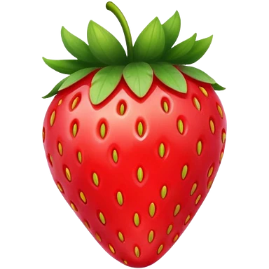 Cinematic plump happy strawberry, glossy bright red, tiny round eyes and blushing cheeks, green leafy top slightly tilted, cheerful and charming. emoji