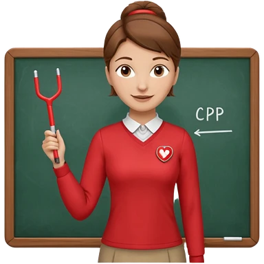 Happy Teacher, female, brown hair up, wearing a red long sleeve top holding a pointer stick to a white board with a CPR logo. emoji
