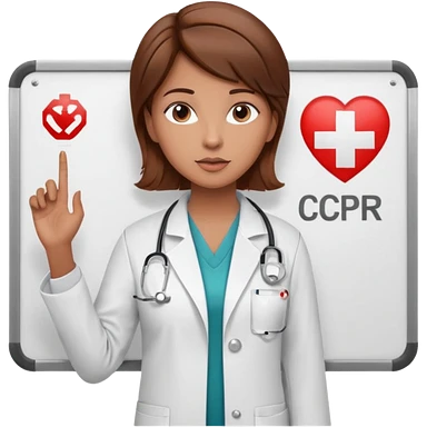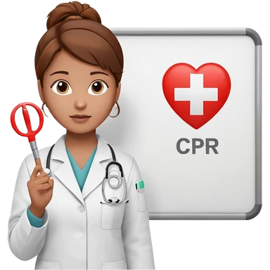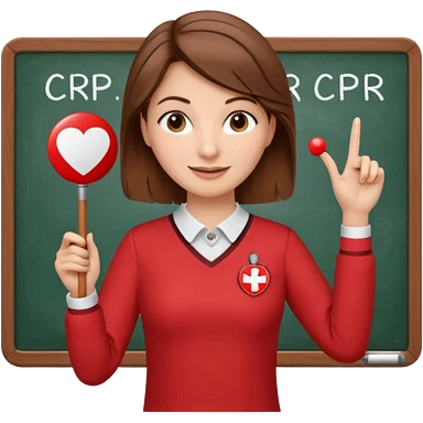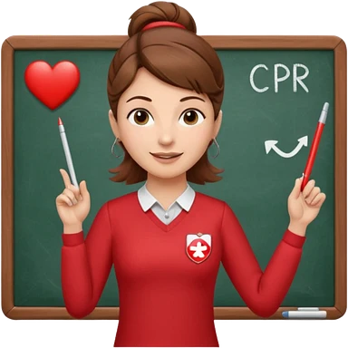 Happy Teacher, female, brown hair up, holding a pointer to a white board with a CPR logo. emoji | AI Emoji Generator