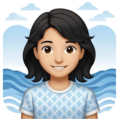 teenager with wavy black hair and dark brown slightly black eyes. wearing a white shirt with light blue patterns on the right and left. Expressing happiness while smiling sweetly emoji