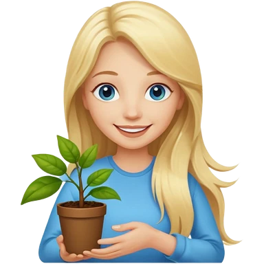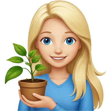 Happy Woman with long blonde hair and blue eyes holding happy plant emoji