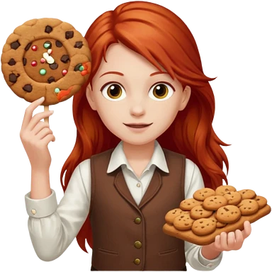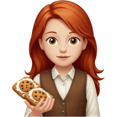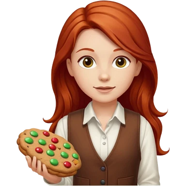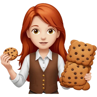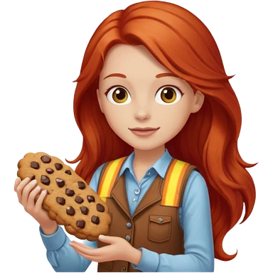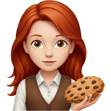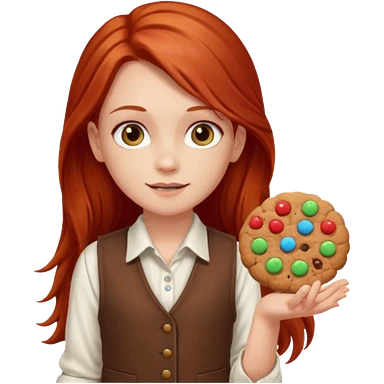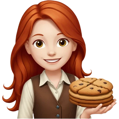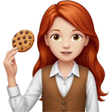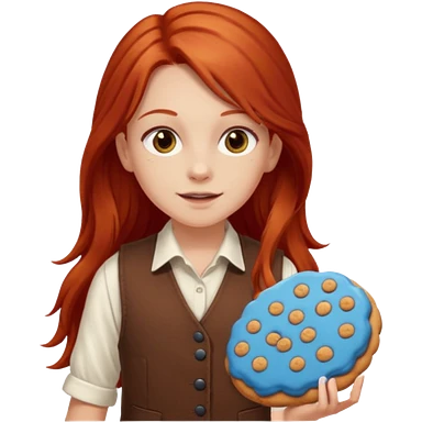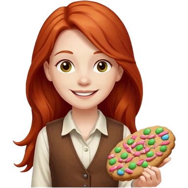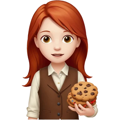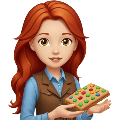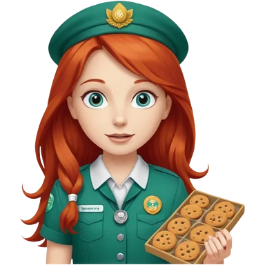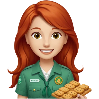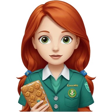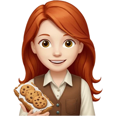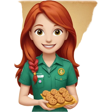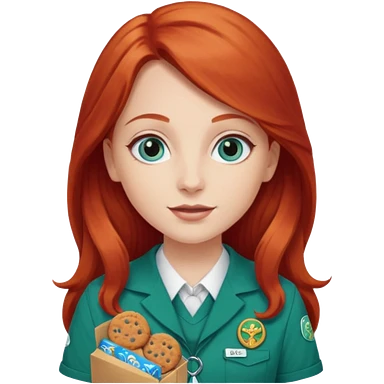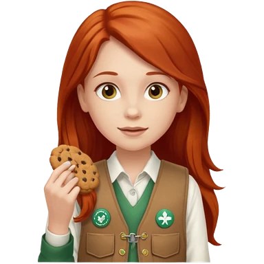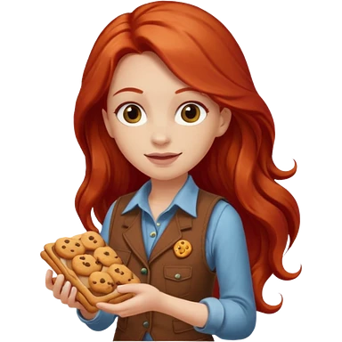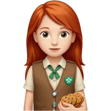 happy white girl scout with red long hair selling cookies with a brown Girl Scout vest and white shirt under vest. She should be around 10 years old emoji | AI Emoji Generator