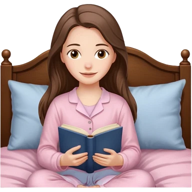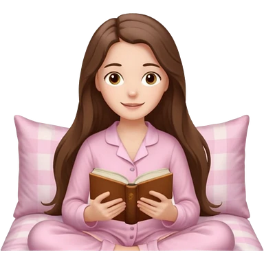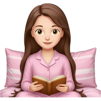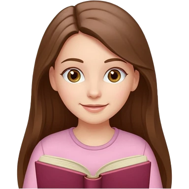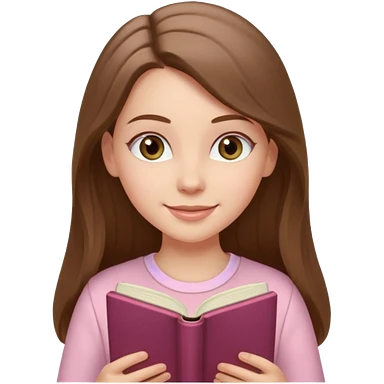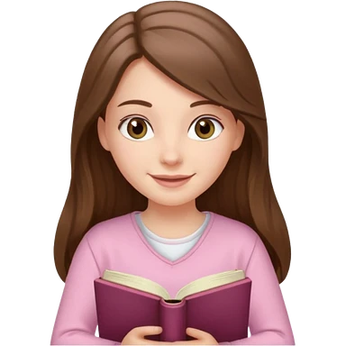 happy white long brunette hair girl with hazel eyes wearing light pink reading a book emoji