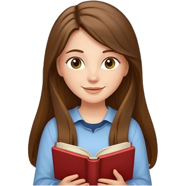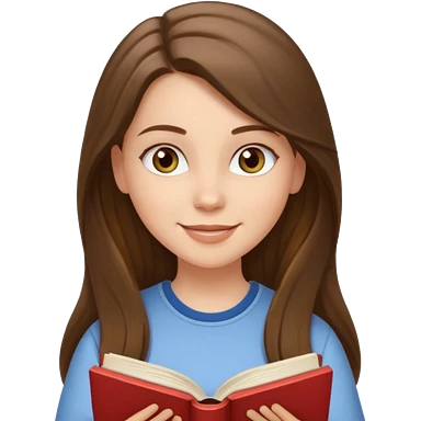 happy white long brunette hair girl with hazel eyes wearing light reading a book emoji