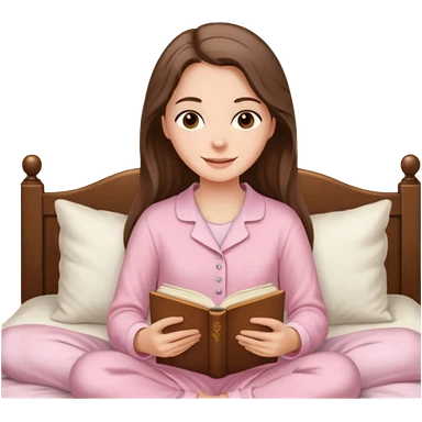 happy white long brunette hair girl with hazel eyes in light pink pajamas reading Pride and Prejudice emoji