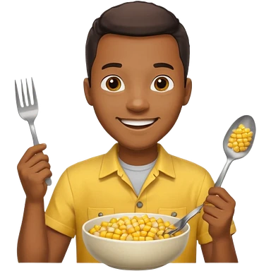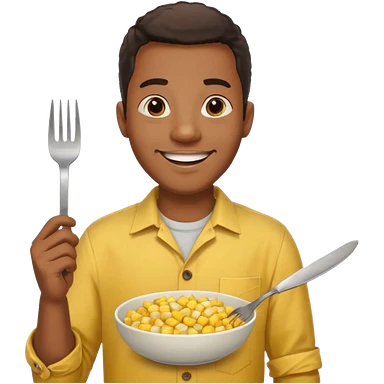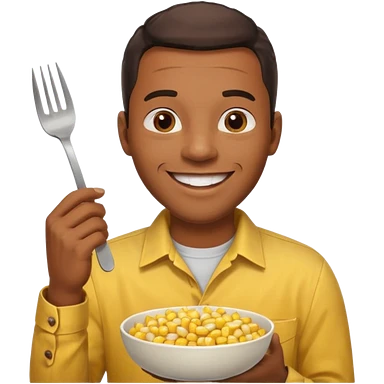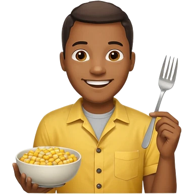 HAPPY BLACK MAN WITH YELLOW OPEN BUTTON-DOWN SHIRT, HOLDING AN FORK AND A COOK CORN BOWL emoji