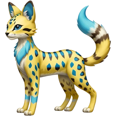 Colorful Yellow Meloetta-Sergal-Serval-Genet-Pokémon-Digimon-Fakémon-fusion-hybrid-creature with Cyan stripes and blue leopard-spot-markings emoji