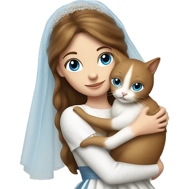 A girl with brown hare and blue eyes hugging a white cat of Britain bride emoji