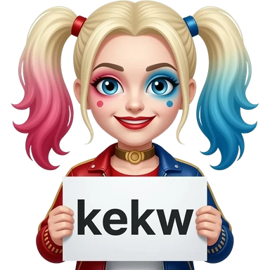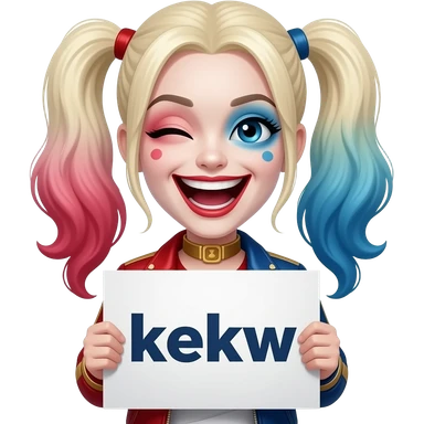 harley quinn con un cartel que ponga kekw y riendose a carcajadas emoji