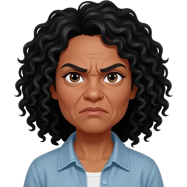 Quiero que le agregues mas arrugas como de una mujer de 30 años y un pelo negro rizado. Además quiero que tenga las cejas frunzidas, como enfadada pero no tanto. emoji