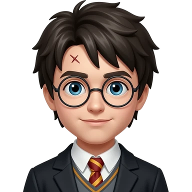 Harry Potter emoji, Apple style, clean 3D, soft gradients, teenage boy age 15–16, messy black hair, round glasses, lightning scar, Gryffindor accents, minimal icon, centered, white background, high detail emoji