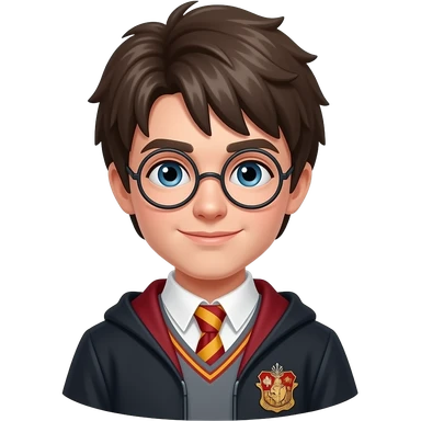 Harry Potter emoji, Apple style, clean 3D, soft gradients, teenage boy age 15–16, messy black hair, round glasses, lightning scar, Gryffindor accents, minimal icon, centered, white background, high detail emoji