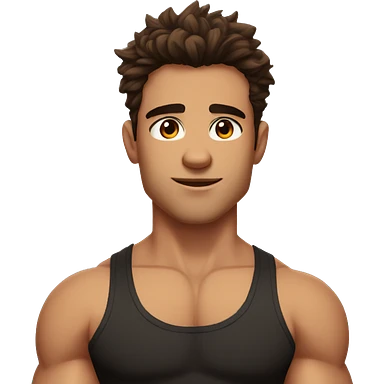 Buff muscular handsome teen guy, brown messy hairy, medium length hair, brown eyes, serious expresssion, black tank top emoji