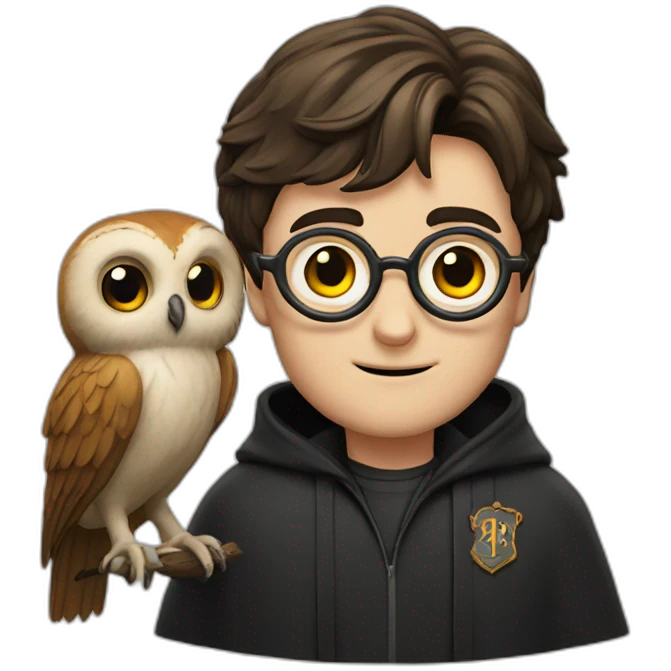 Harry Potter wearing a Santa hat and cozy scarf, holding a snowy owl perched on his arm, looking excited for a magical Christmas emoji