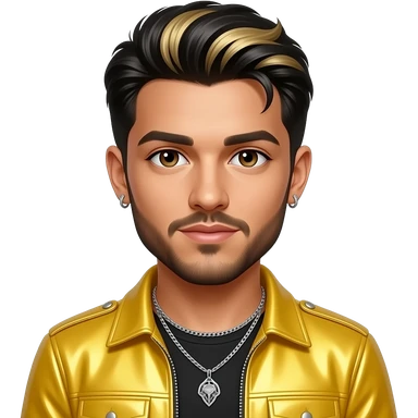 Zayn Malik from One Direction with brown eyes, black hair with blonde highlights, yellow metallic pop tour outfit, necklace and earrings emoji