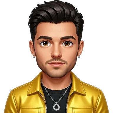 Zayn Malik from One Direction with brown eyes, black hair, yellow metallic pop tour outfit, necklace and earrings emoji