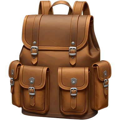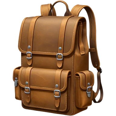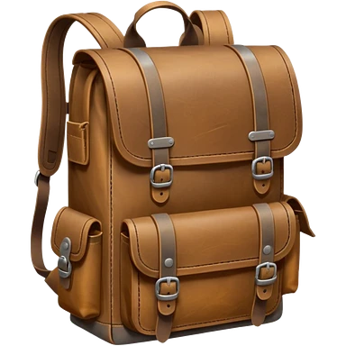 A sturdy, weathered leather backpack with metal-reinforced flaps and deep, practical pockets. Scratched and rugged from long travel, it has a solid, utilitarian look—built for harsh roads and hard use. emoji