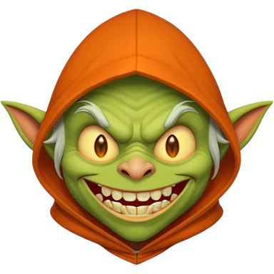 Hobgoblin-style goblin face emoji, orange hood, evil grin, sharp teeth, expressive Apple-style emoji emoji